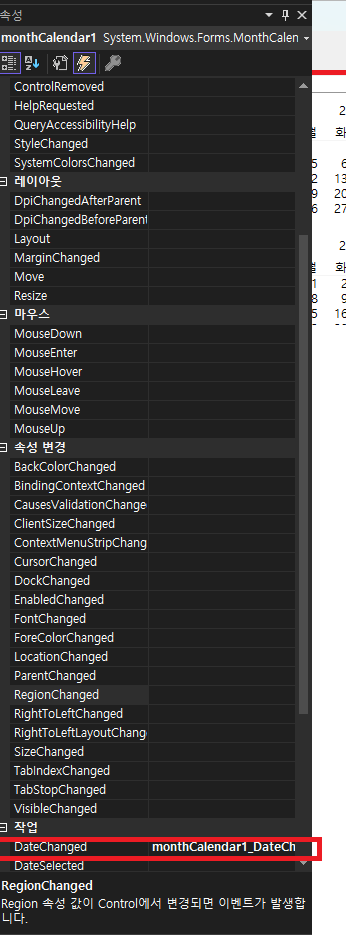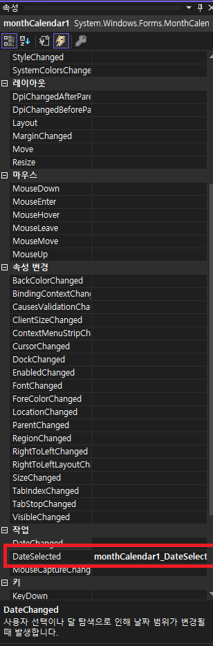 기간 선택이 끝나면 바로 해야할 작업이 있다면 DateSelected 이벤트를 사용하면 된다.
