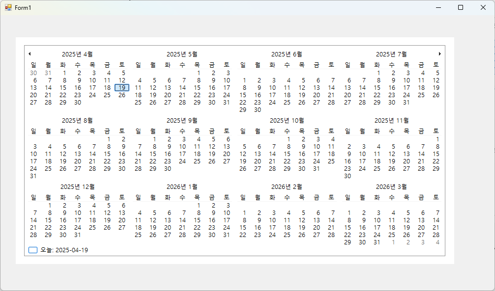 이 컨트롤은 개월을 표시하는데 표시하는 방법이 CalendarDimensions 속성을 이용하는데